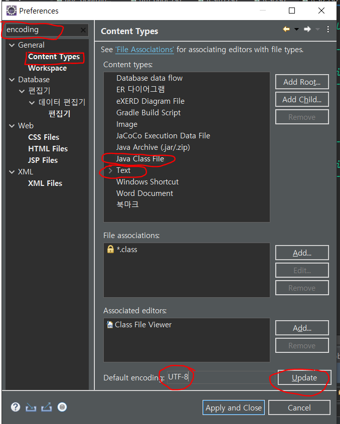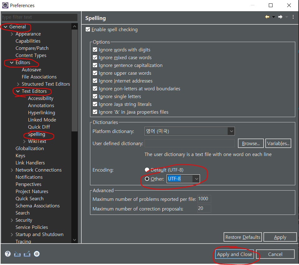 General > Editors > Text Editors > Spelling > UTF-8 인코딩 설정 후 Apply and Close 를 눌러 적용후 닫습니다