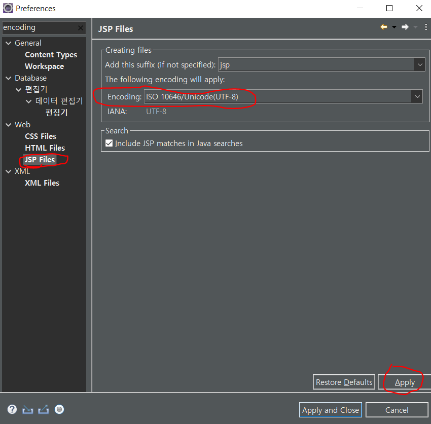 CSS,HTML,JSP,XML 모두 인코딩 설정을 UTF-8 로 변경우 Apply를 눌러 적용 시켜줍니다.