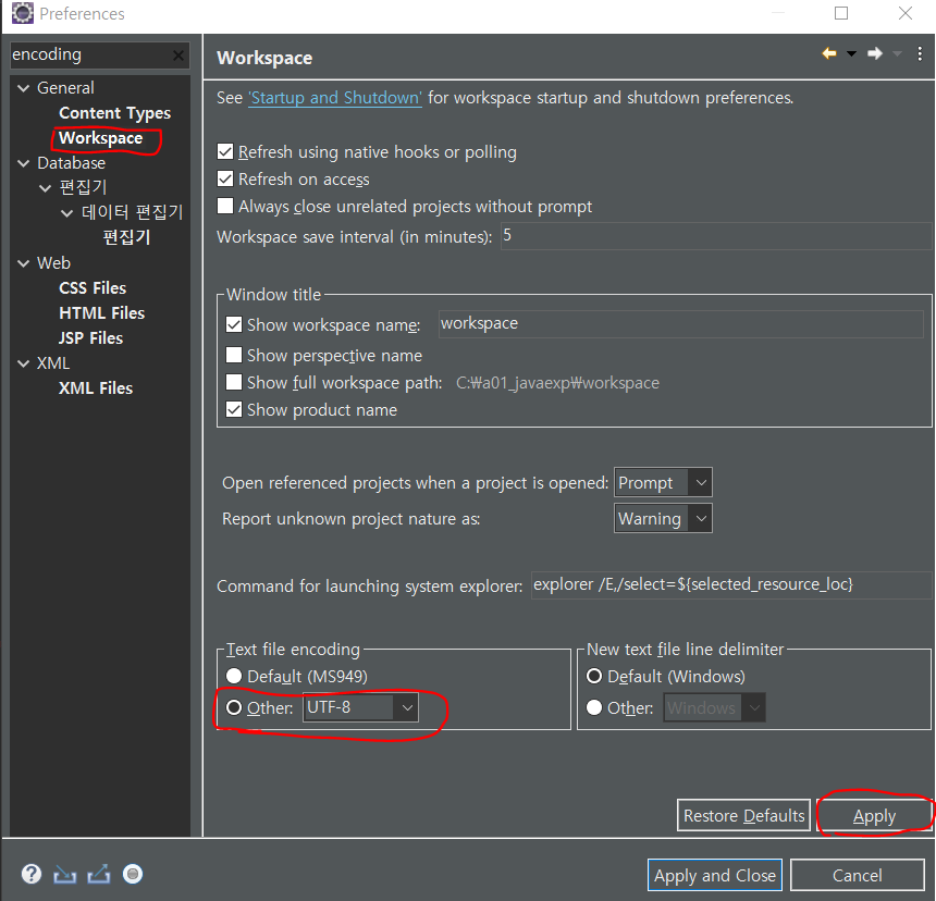 workspace 란에서 Other(UTF-8) 지정 후 Apply를 눌러줍니다