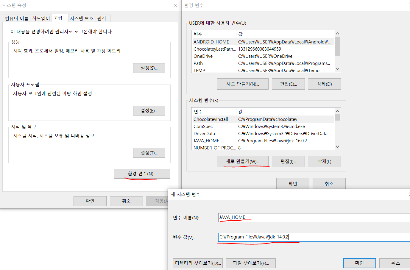 먼저 윈도우 검색에서 => 시스템 ▶ 환경변수 ▶ 시스템 변수 ▶ 새로만들기
