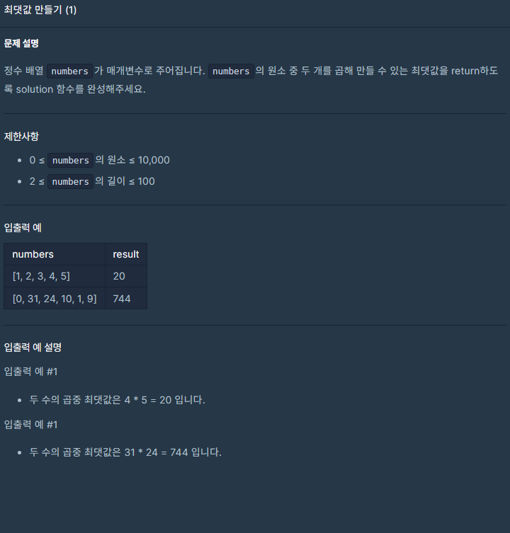 프로그래머스(JAVA) / 최댓값 만들기(1) 본문