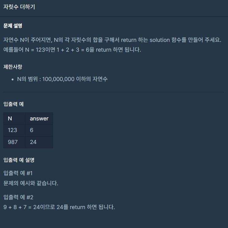 프로그래머스(JAVA) / 자릿수 더하기 본문